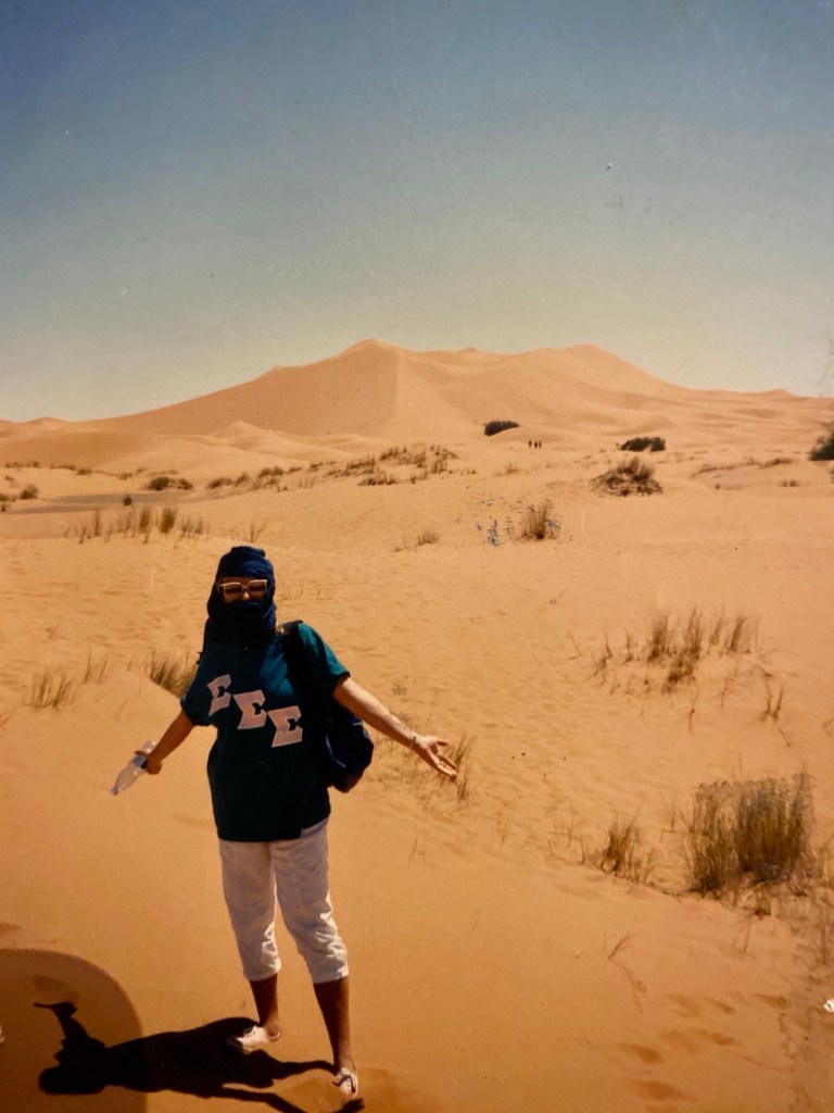 April 1988. I’m standing in the Sahara Desert, wearing a sorority T-shirt and a tagelmust, a little sunburned, carefree, and completely unaware that this trip would mark me forever.