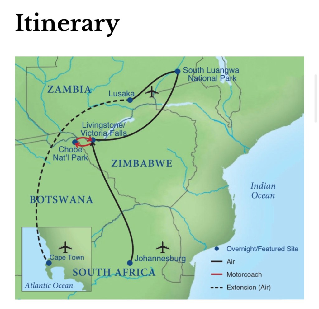 This was the itinerary for our African Safari. We did NOT do the extension at the end to Cape Town — we’re saving that for next time!