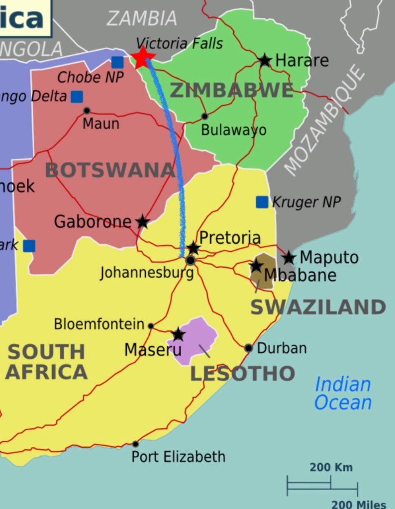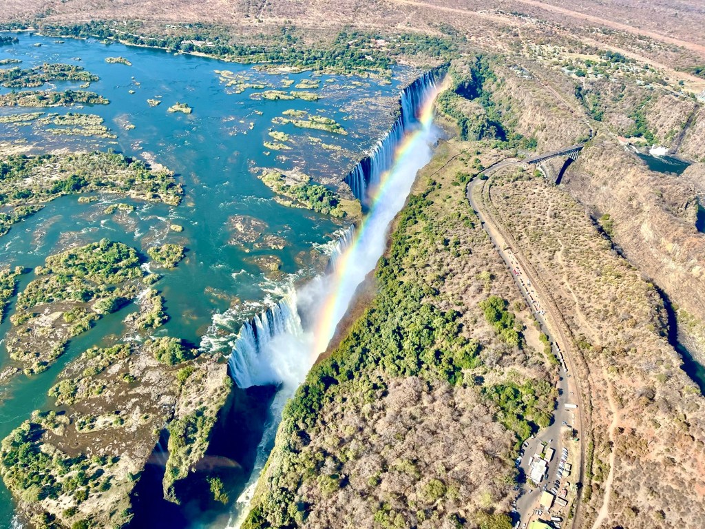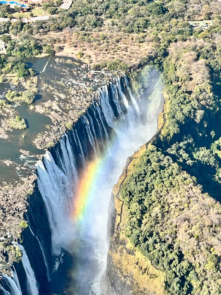 We boarded our Fastjet Embraer 145 LR this morning from Johannesburg and headed to Victoria Falls, Zimbabwe. After the flight attendant sprayed an insecticide to make sure there are no pests traveling aboard from one country to the next, we settled in for our 1 hour 40 minute flight north. We’re expecting a warm 80 degree Fahrenheit day as we explore one of the world’s largest waterfalls located on the boarder between Zimbabwe 🇿🇼 and Zambia 🇿🇲. Located on the Zambezi River, Victoria Falls has a width of 1,708 m (5,604 ft) and was named for Queen Victoria of England by Scottish explorer, David Livingstone after he identified the falls in 1855.