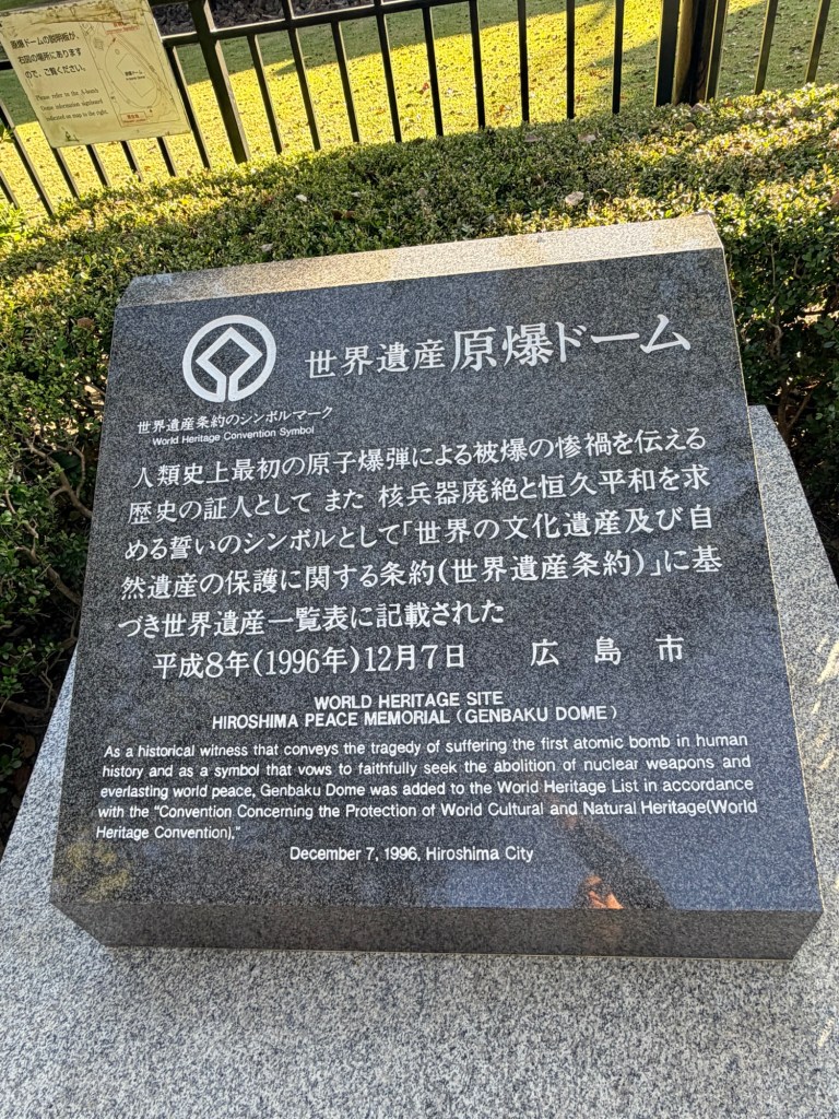 After lunch we visited the Hiroshima Peace Memorial Museum. If you visit Hiroshima, I can’t stress enough how important it is to experience this museum. Before entering, there is a sign for parents and teachers, encouraging them to prepare children for the exhibits. Adults—take that same advice and prepare yourselves. It is informative, moving, and, at times, very difficult to digest, but the museum is essential for understanding the full impact of the atomic bombing on August 6, 1945. Artifacts from the time (including children’s clothing), personal stories of survivors, and detailed historical accounts bring the past to life in a way that is both heartbreaking and eye-opening. When the bomb was dropped, 200,000+ people perished that day or after due to radiation exposure. Some died years later from diseases caused by the bomb. Ken-San recommended a Japanese documentary called Silent Fallout and talked about how we were all victims of the atomic bomb—including those in the USA. We know this first hand due to Cold Water Creek where I grew up in Florissant, Missouri.