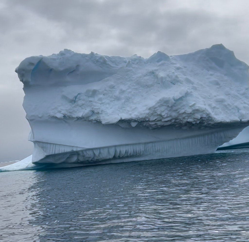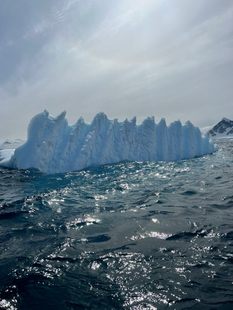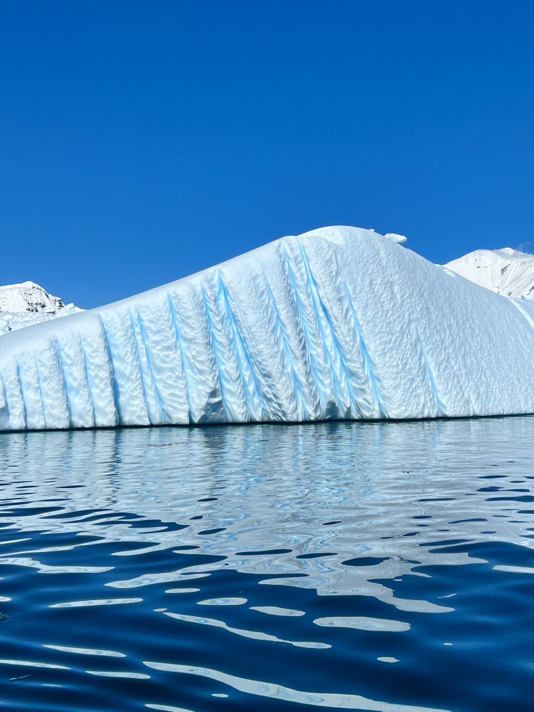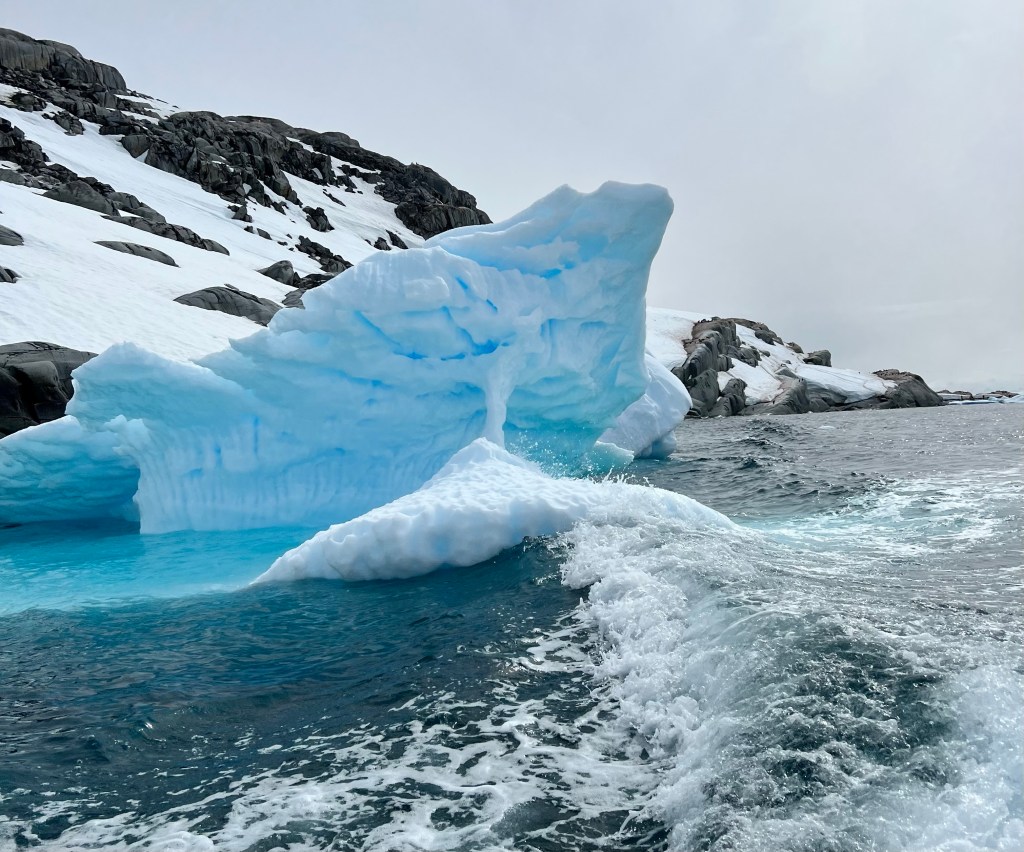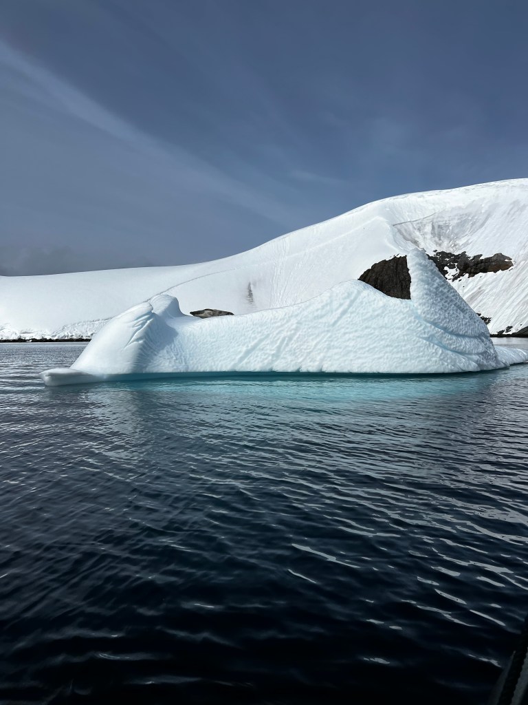 Icebergs are made from frozen freshwater (even though they float in salt water) and break off from glaciers in a process called calvingIcebergs can have the following shapes: tabular, dome-shaped, sloping, pinnacled, dry-docked, blocky, weathered or glacier (irregular shaped). Which shape do you think this one resembles?There are 3 main types of icebergs: 1. Growler (less than 1 meter); 2. Bergy Bit (1 meter but less than 5 meters); 3. Iceberg (>5 meters)Icebergs can be many colors: White is the younger icebergs; Blue is the older ice; Black ice is gorgeous but also harder to see as it’s transparent and heavier; Floating ice sheet; and Dirty ice has sand and mud mixed in This iceberg is camping out in the Antarctic OceanWhite with shades of blue under the water (and a crabeater seal on top)Lichenlike’n the iceberg!Room with a view!Hanging out amongst the icebergs It’s like a wave got caught in the ice!The peaks of this iceberg are incredible!Closer view of those ice peaks This one is a cousin to the StegosaurusAbout 90 percent of the iceberg is below the water’s surface – and this is some old ice due to the beautiful blue colorGrowlers are small chunks of floating ice that rise about 1 meter (3 feet ) out of the water. They are called growlers for the animal-like growling sound the trapped air makes as it escapes when the iceberg meltsOne of our zodiacs exploring. We cannot get too close to icebergs due to calving!Sink your “teeth” into this iceberg!A few wrinkles and blue ice to show it’s age!The light coming through this iceberg was mesmerizing!Something clawed at this iceberg!An ice shelf is a floating extension of the land it is attached to. Antarctica is surrounded by ice shelves. Sea ice is free-floating, contains icebergs, and freezes and unfreezes each season. Taking it all in Right outside our cabin – my favorite!Also right outside our cabin and comes with a pool!