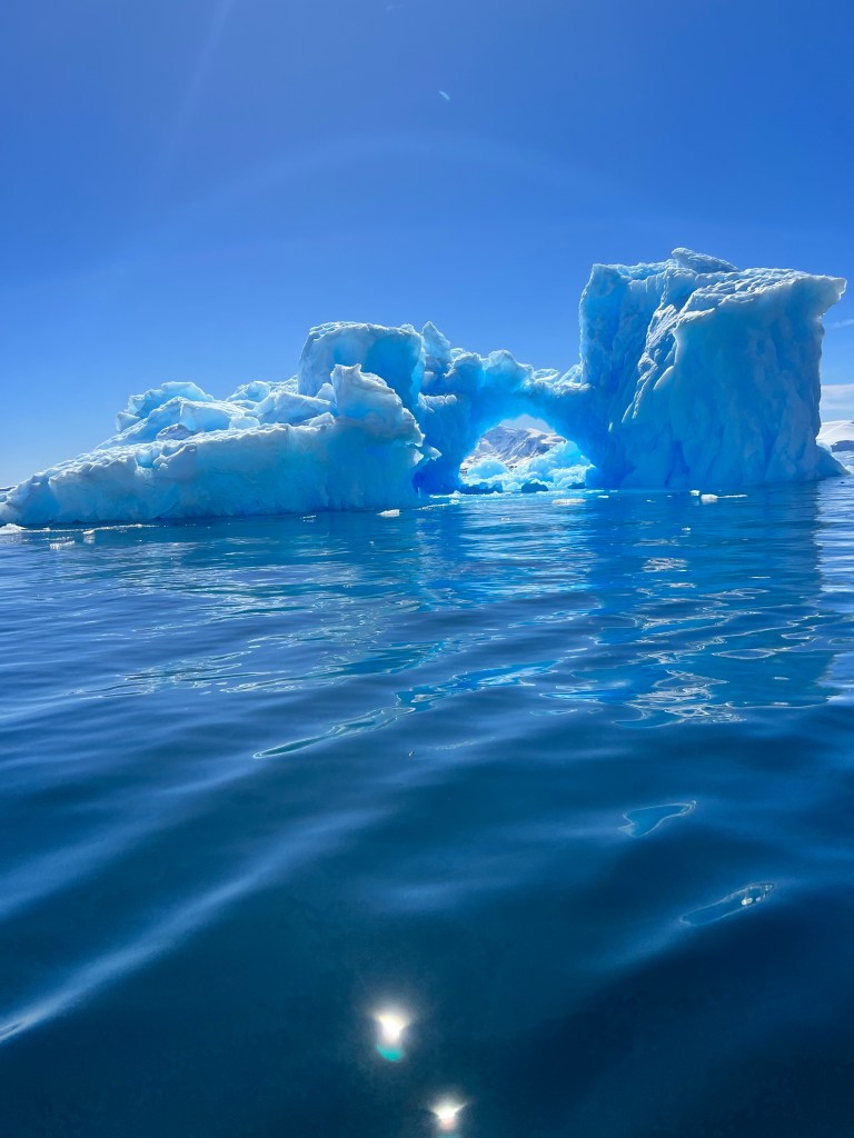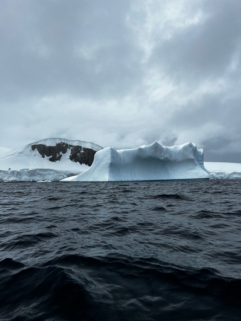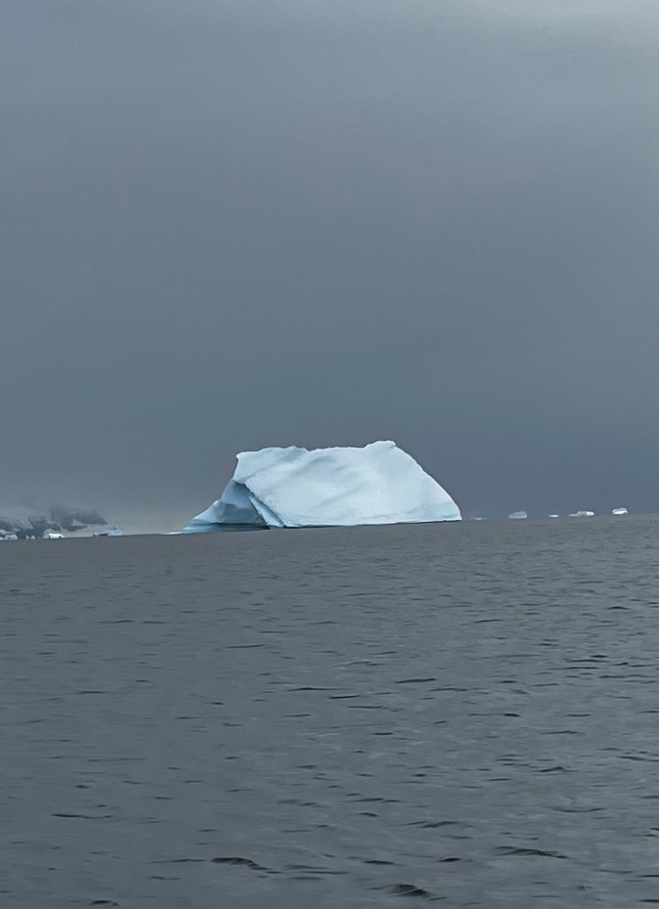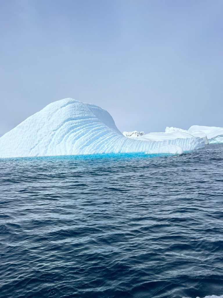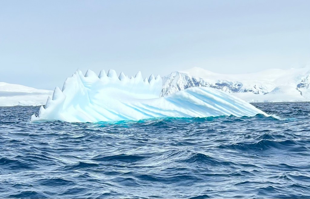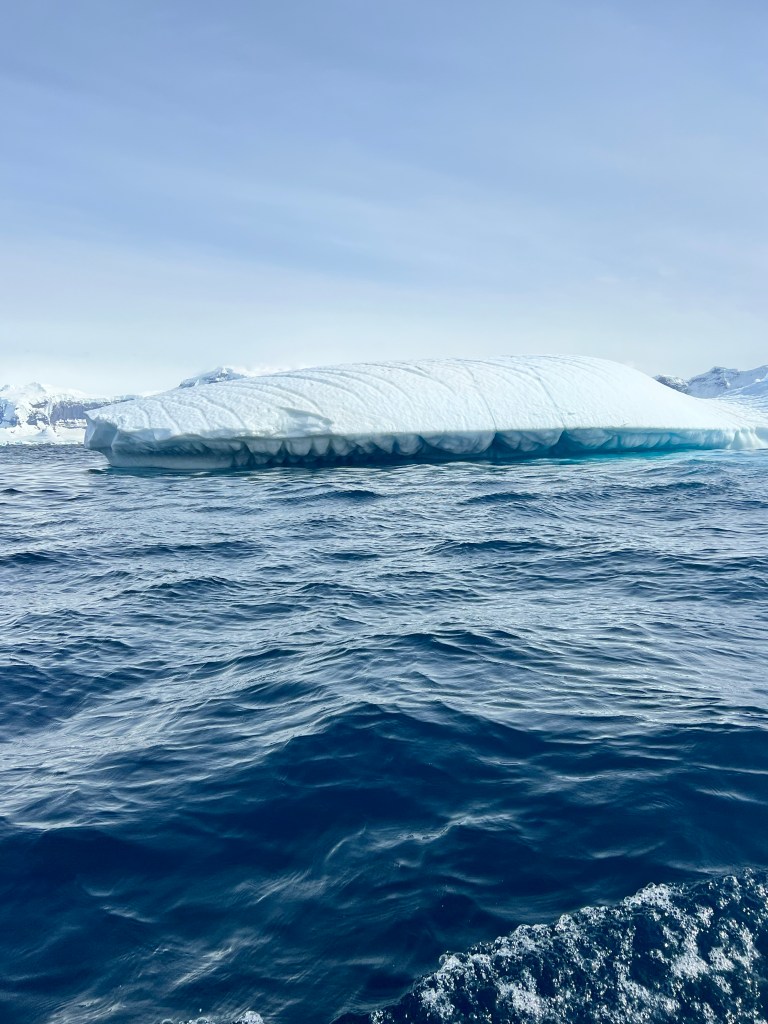 Icebergs are made from frozen freshwater (even though they float in salt water) and break off from glaciers in a process called calvingIcebergs can have the following shapes: tabular, dome-shaped, sloping, pinnacled, dry-docked, blocky, weathered or glacier (irregular shaped). Which shape do you think this one resembles?There are 3 main types of icebergs: 1. Growler (less than 1 meter); 2. Bergy Bit (1 meter but less than 5 meters); 3. Iceberg (>5 meters)Icebergs can be many colors: White is the younger icebergs; Blue is the older ice; Black ice is gorgeous but also harder to see as it’s transparent and heavier; Floating ice sheet; and Dirty ice has sand and mud mixed in This iceberg is camping out in the Antarctic OceanWhite with shades of blue under the water (and a crabeater seal on top)Lichenlike’n the iceberg!Room with a view!Hanging out amongst the icebergs It’s like a wave got caught in the ice!The peaks of this iceberg are incredible!Closer view of those ice peaks This one is a cousin to the StegosaurusAbout 90 percent of the iceberg is below the water’s surface – and this is some old ice due to the beautiful blue colorGrowlers are small chunks of floating ice that rise about 1 meter (3 feet ) out of the water. They are called growlers for the animal-like growling sound the trapped air makes as it escapes when the iceberg meltsOne of our zodiacs exploring. We cannot get too close to icebergs due to calving!Sink your “teeth” into this iceberg!A few wrinkles and blue ice to show it’s age!The light coming through this iceberg was mesmerizing!Something clawed at this iceberg!An ice shelf is a floating extension of the land it is attached to. Antarctica is surrounded by ice shelves. Sea ice is free-floating, contains icebergs, and freezes and unfreezes each season. Taking it all in Right outside our cabin – my favorite!Also right outside our cabin and comes with a pool!