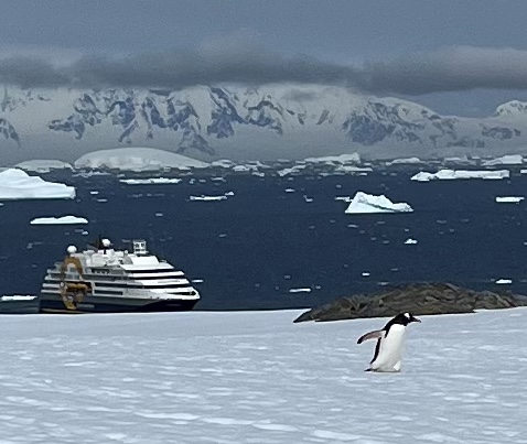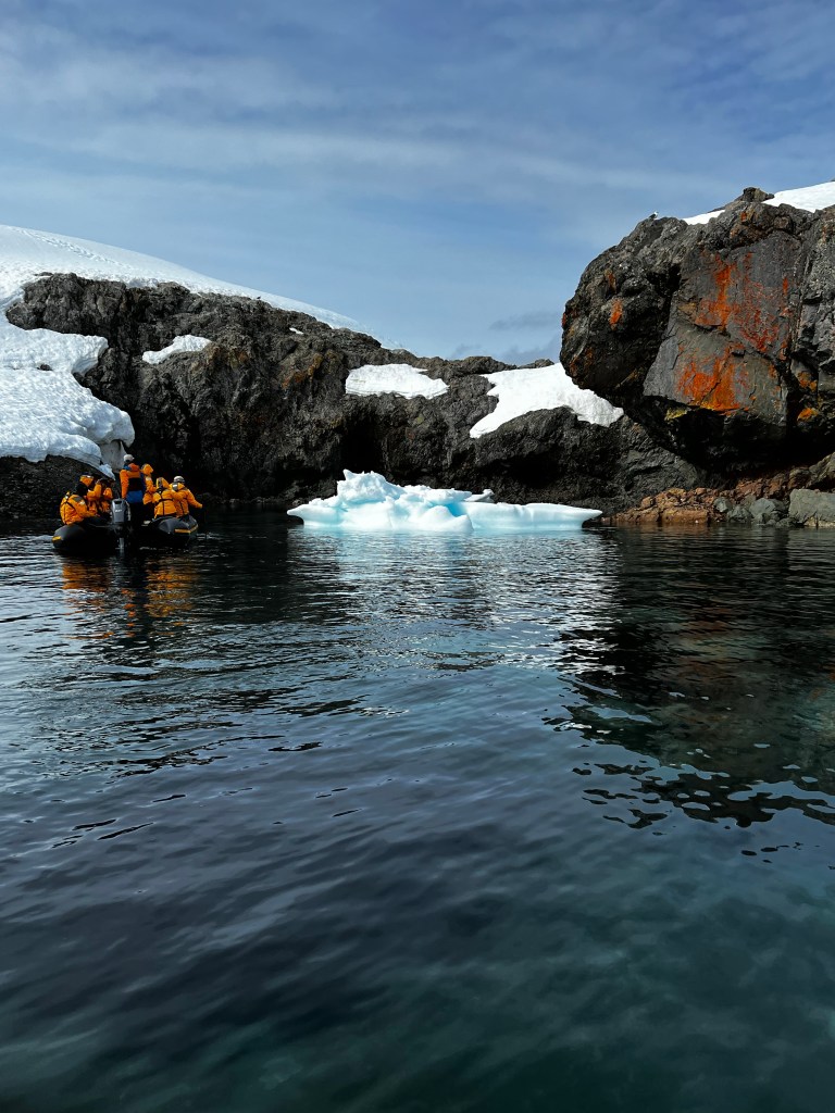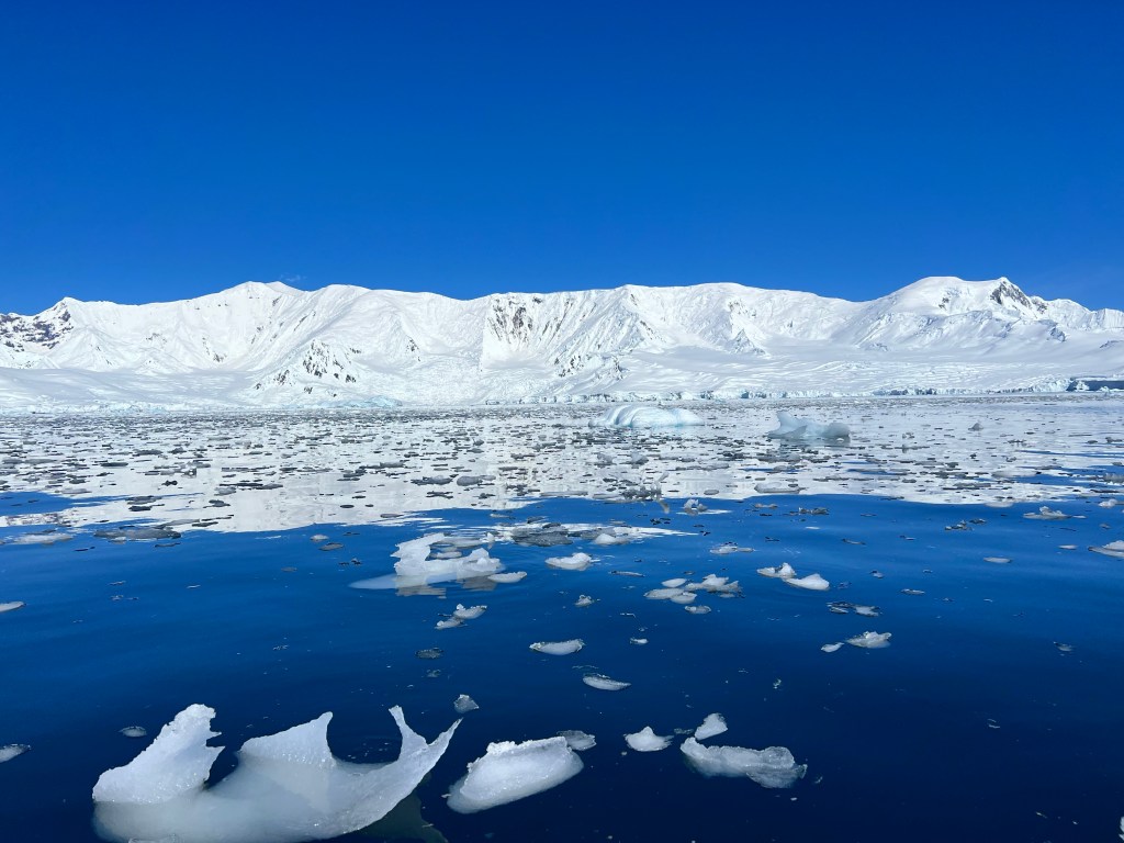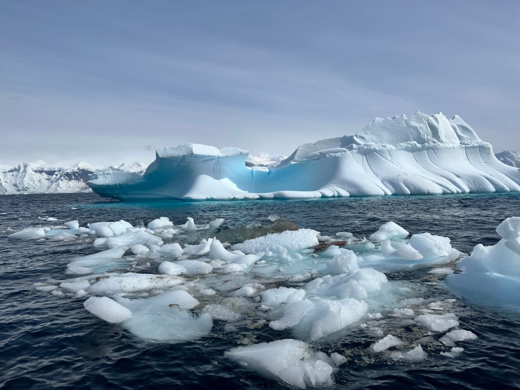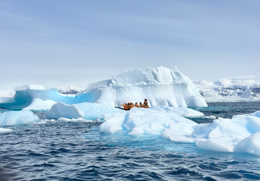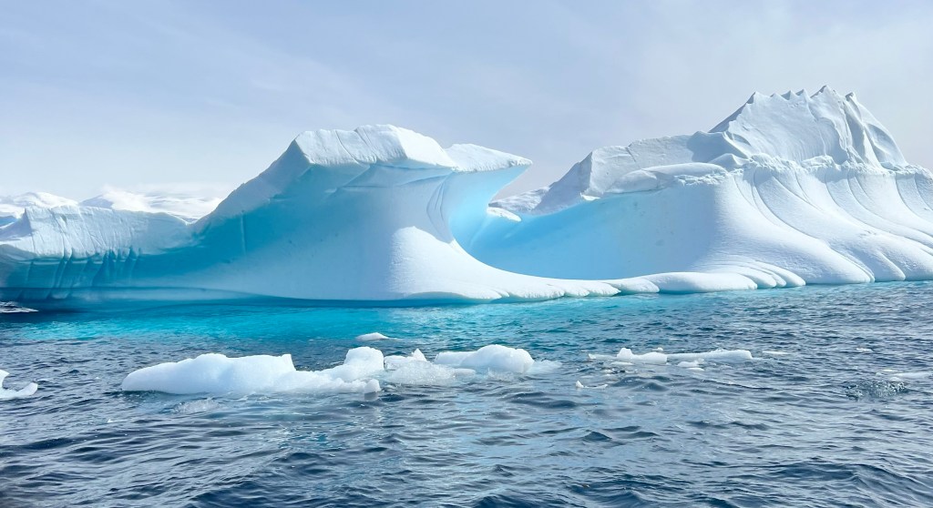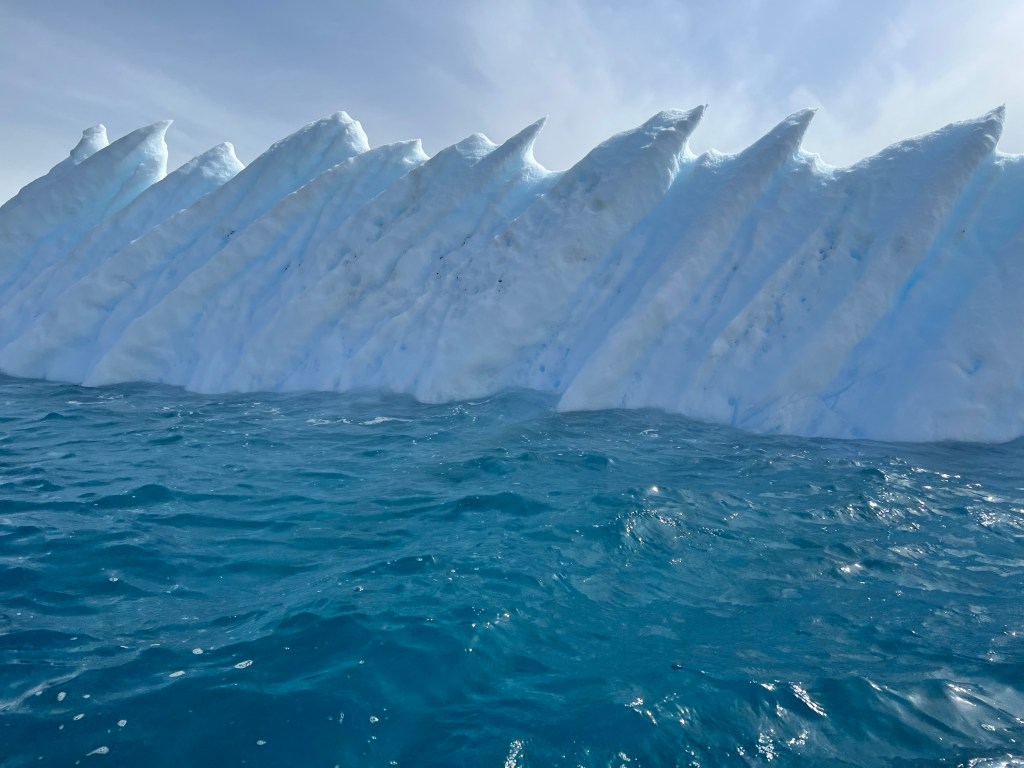 Icebergs are made from frozen freshwater (even though they float in salt water) and break off from glaciers in a process called calvingIcebergs can have the following shapes: tabular, dome-shaped, sloping, pinnacled, dry-docked, blocky, weathered or glacier (irregular shaped). Which shape do you think this one resembles?There are 3 main types of icebergs: 1. Growler (less than 1 meter); 2. Bergy Bit (1 meter but less than 5 meters); 3. Iceberg (>5 meters)Icebergs can be many colors: White is the younger icebergs; Blue is the older ice; Black ice is gorgeous but also harder to see as it’s transparent and heavier; Floating ice sheet; and Dirty ice has sand and mud mixed in This iceberg is camping out in the Antarctic OceanWhite with shades of blue under the water (and a crabeater seal on top)Lichenlike’n the iceberg!Room with a view!Hanging out amongst the icebergs It’s like a wave got caught in the ice!The peaks of this iceberg are incredible!Closer view of those ice peaks This one is a cousin to the StegosaurusAbout 90 percent of the iceberg is below the water’s surface – and this is some old ice due to the beautiful blue colorGrowlers are small chunks of floating ice that rise about 1 meter (3 feet ) out of the water. They are called growlers for the animal-like growling sound the trapped air makes as it escapes when the iceberg meltsOne of our zodiacs exploring. We cannot get too close to icebergs due to calving!Sink your “teeth” into this iceberg!A few wrinkles and blue ice to show it’s age!The light coming through this iceberg was mesmerizing!Something clawed at this iceberg!An ice shelf is a floating extension of the land it is attached to. Antarctica is surrounded by ice shelves. Sea ice is free-floating, contains icebergs, and freezes and unfreezes each season. Taking it all in Right outside our cabin – my favorite!Also right outside our cabin and comes with a pool!