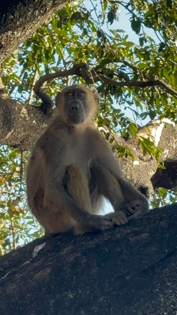 But let’s not forget about the kudus—the males with their stately antlers and white stripes; the Impalas-the McDonald’s of the animal kingdom in Chobe as we saw hundreds!; the Zebras – not as dominant here but we may not have been in the right place at the right time; the Sables—another antelope with prominent antlers and more rare to see; a whole bunch of Guinea fowl; Giraffes —who seemed the most skittish around our vehicles; Hippos – lazily laying on the river front; Crocs—also being lazy on the river front; Baboons—what can I say, we descended from them and they are awesome!; Vervet monkeys-the cutest little faces but they bite; African Buffalo—one particular older male didn’t like it we drove by so we bolted!; Leopard—got the “tail” end; Fish Eagle—reminds me of the majestic American Eagle; and a whole lot of birds that I need to look up.